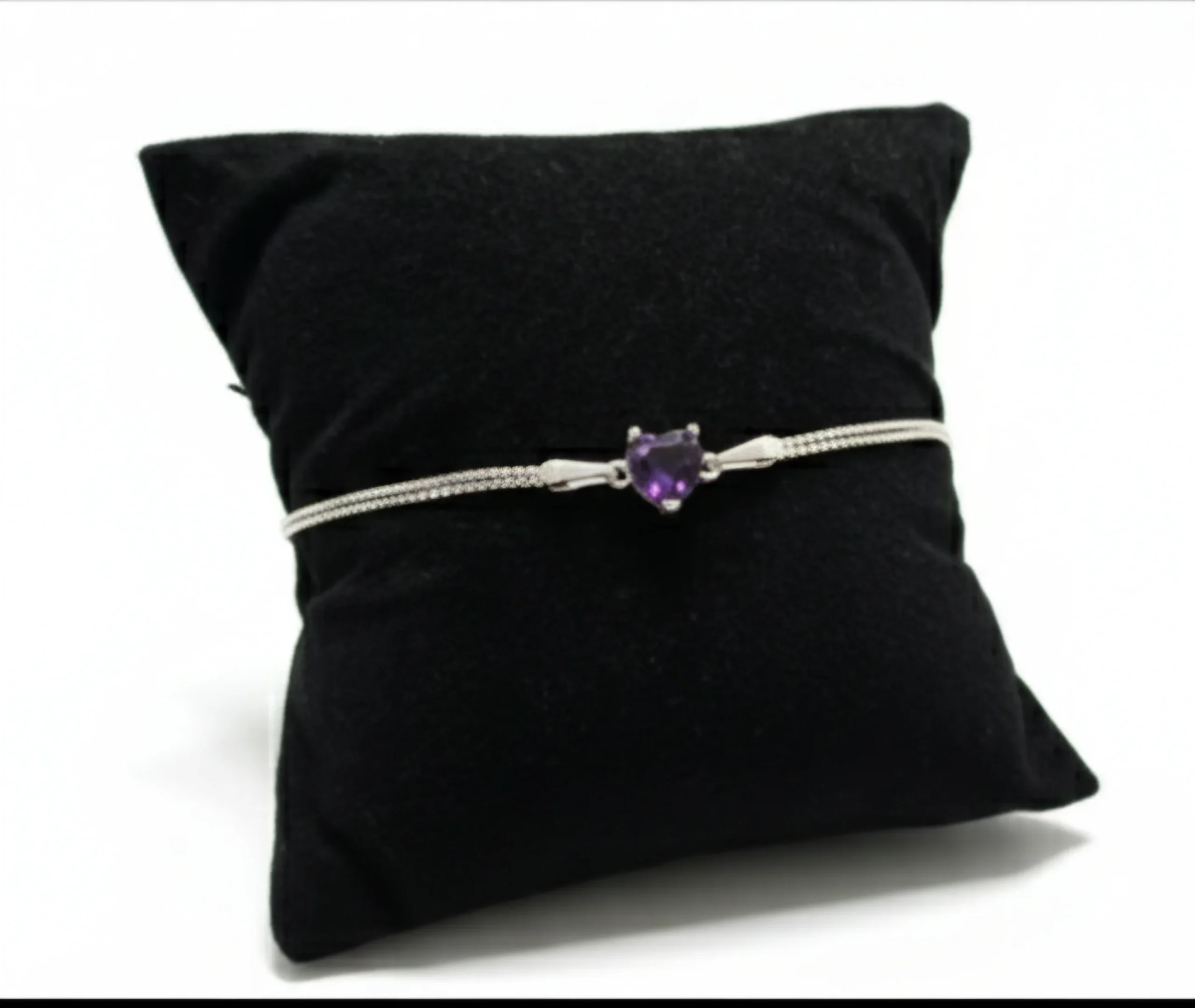 Delikatna i privlačna narukvica od Srebra 925. Centralni element je briljantni ljubičasti cirkon u obliku srca, postavljen na tanki dupli lanac. Savršeni akcenat boje i romantičan poklon za voljenu osobu.