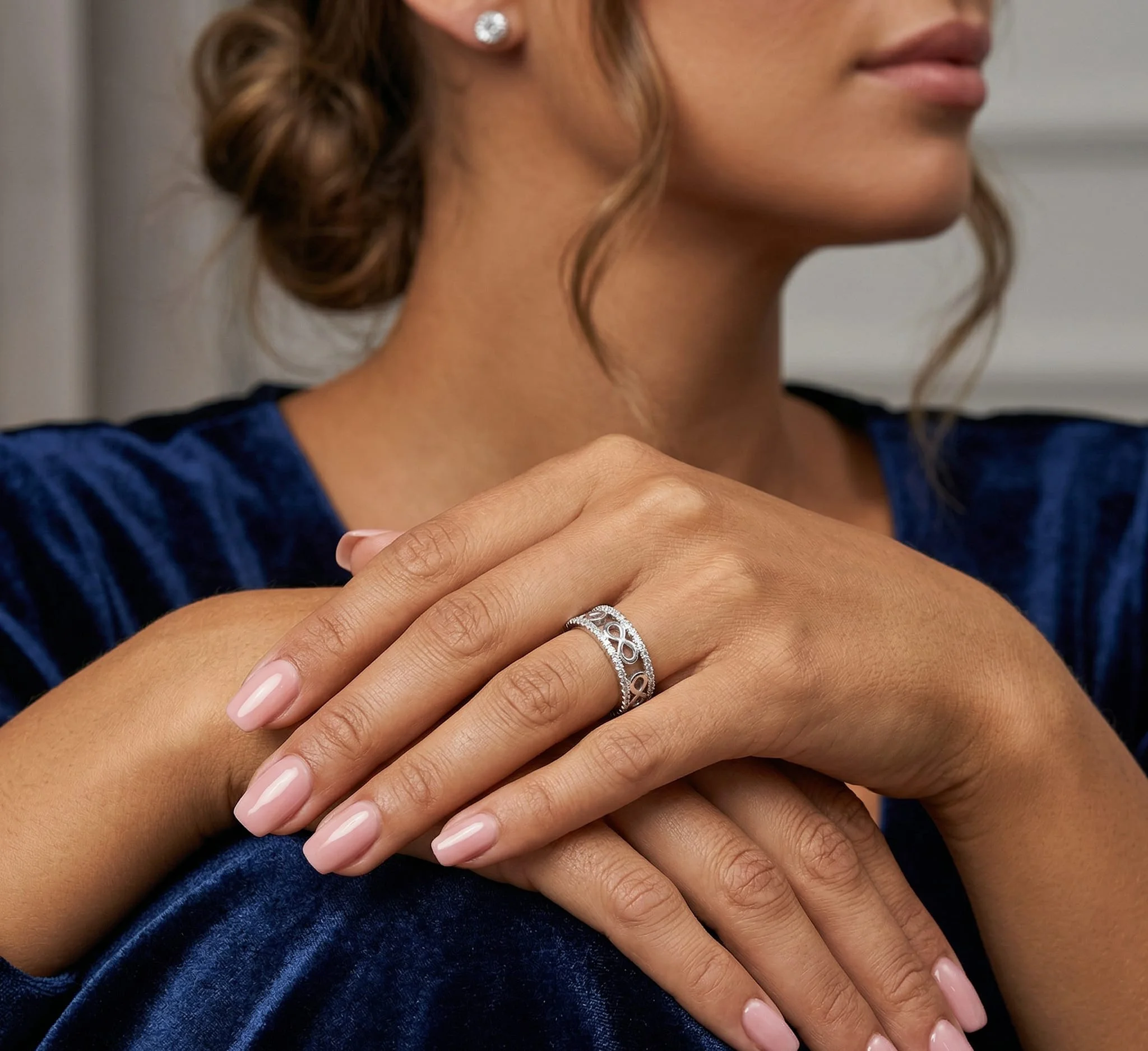 Dizajn: Glamurozan motiv sa nizom simbola „Beskonačnost“ (Infinity) u sredini, oivičen svetlucavim cirkonima sa obe strane.