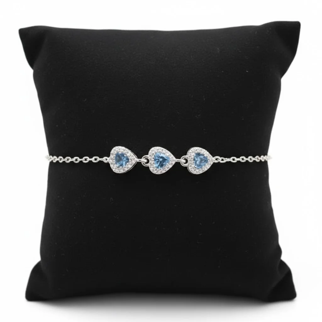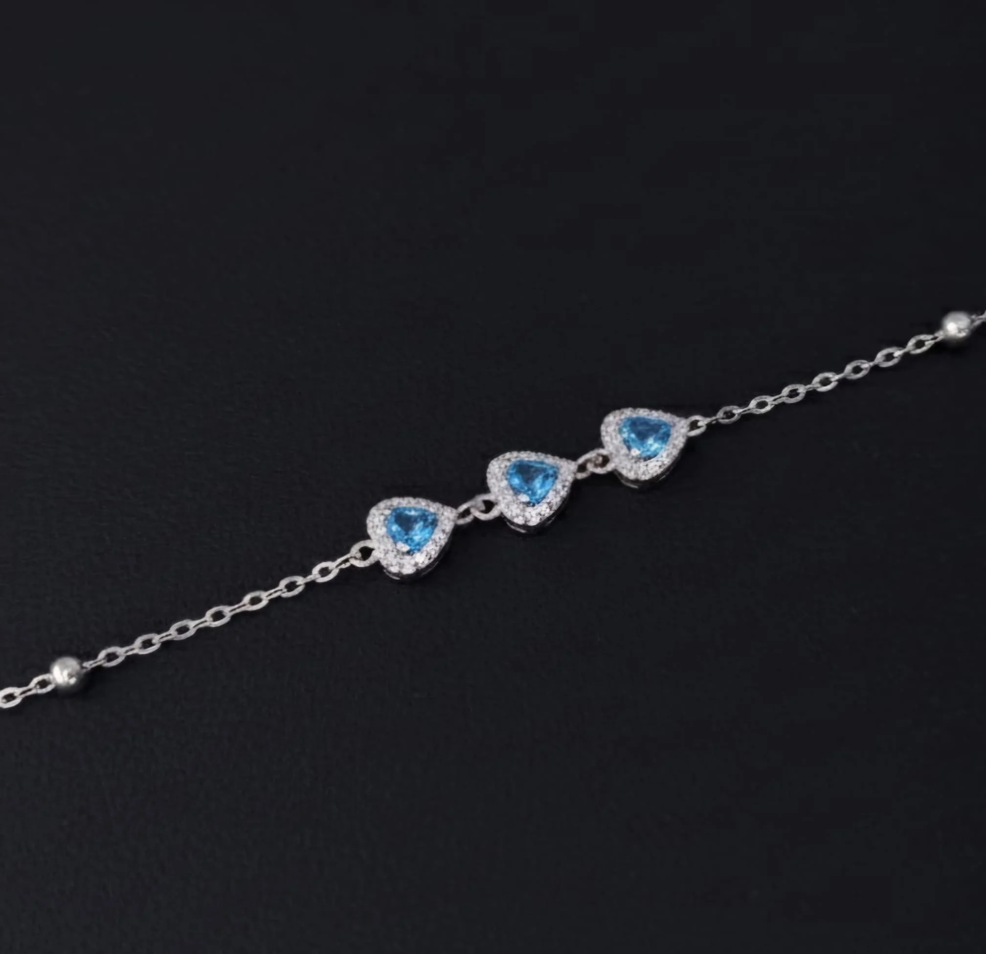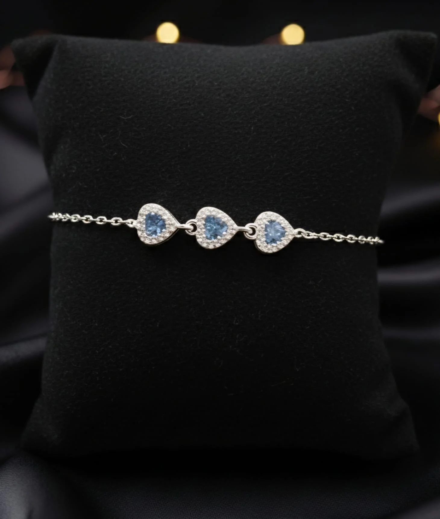 Delikatna i romantična, ova narukvica je izrađena od kvalitetnog Srebra 925. Centralni motiv čine tri povezana srca, od kojih svako sadrži blistavi plavi cirkon u obliku suze, okružen manjim belim cirkonima. Savršeni simbol ljubavi i elegancije.