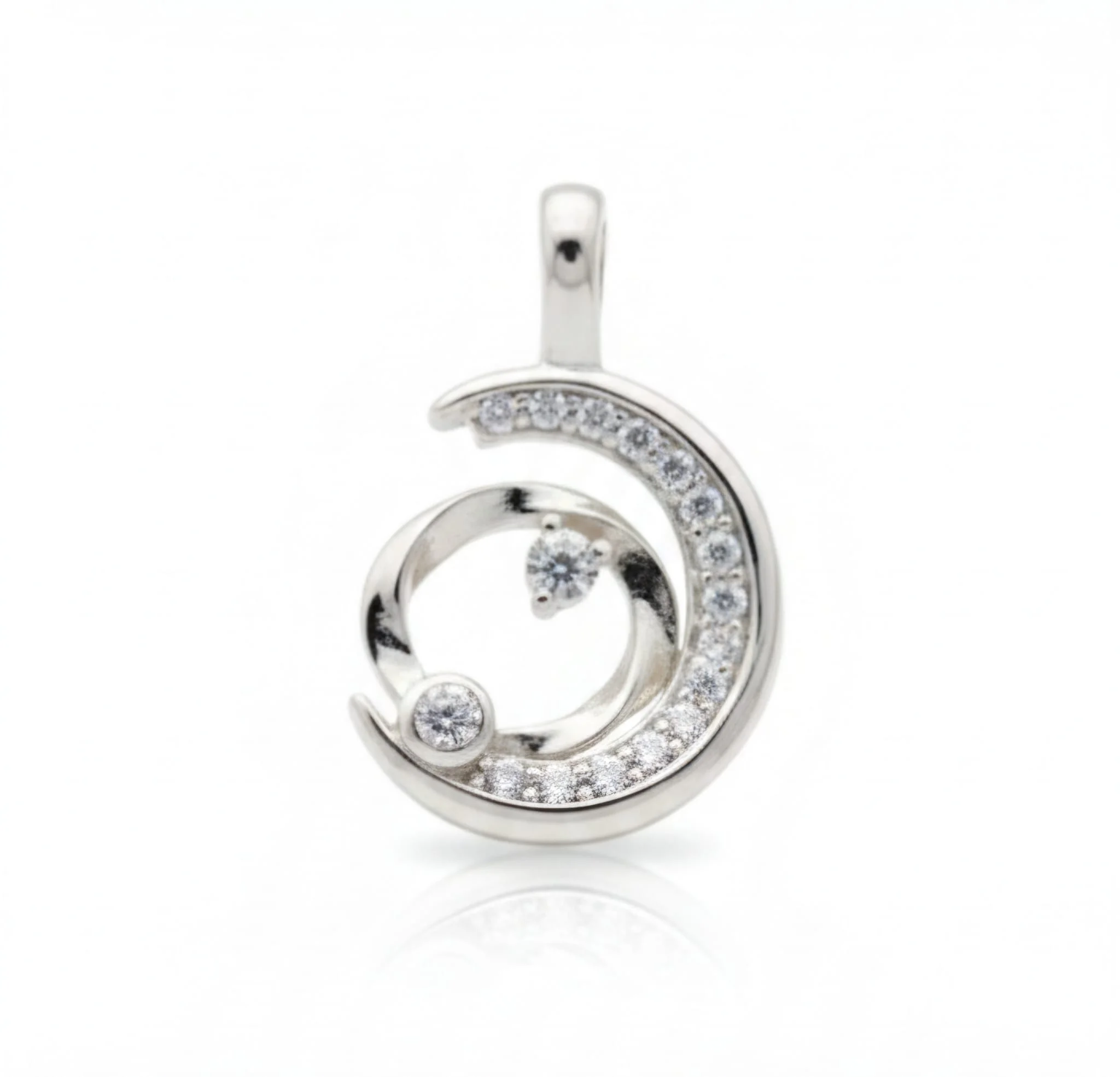Dizajn ovog modela fokusiran je na stilizovanu formu polumeseca koja u svom zagrljaju drži „zvezdanu prašinu“ predstavljenu blistavim cirkonima. Centralni deo priveska krase dva krupnija cirkona koji simbolizuju najsjajnije zvezde, dok je sam luk polumeseca precizno optočen nizom sitnijih kristala. Ovakva postavka omogućava maksimalnu refleksiju svetlosti, dajući Srebrnom privesku Polumesec sa zvezdanom prašinom 925 neviđen nivo blistavosti pri svakom pokretu. Dinamične linije i spiralni detalji unutar kruga daju ovom nakitu umetničku dubinu i prefinjenost.