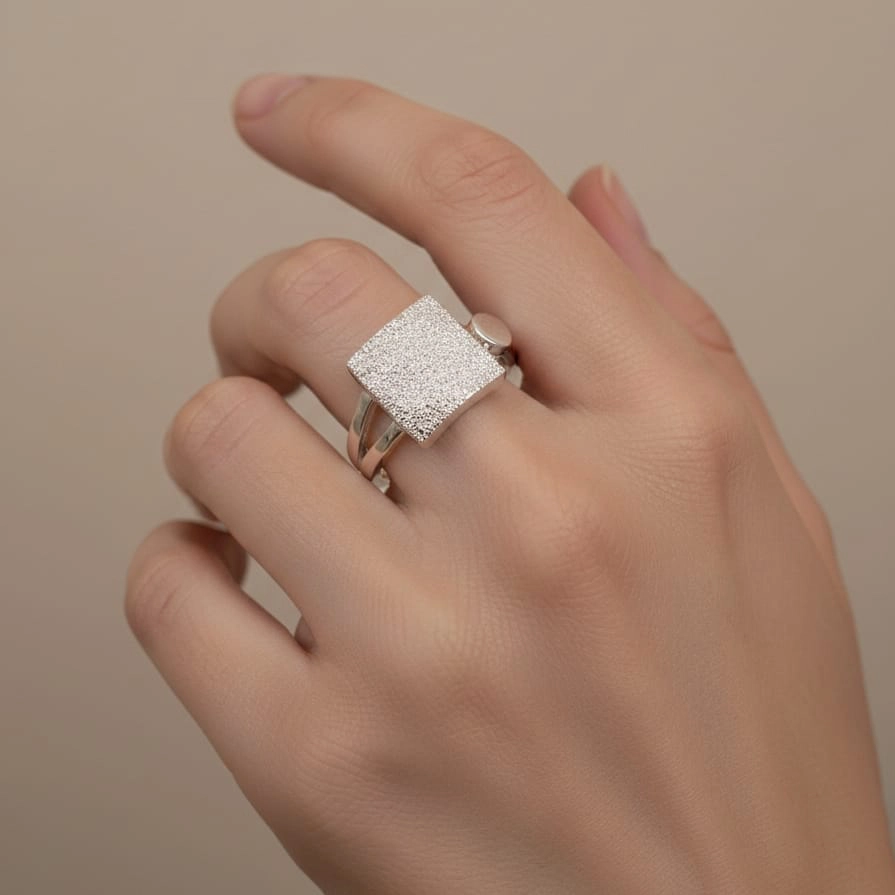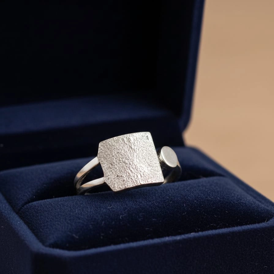 Ako tražite nakit koji više liči na malu skulpturu nego na klasičan prsten, srebrni prsten Matirani kvadrat je vaš savršen izbor. Ovaj model prkosi tradicionalnim formama, stavljajući u prvi plan sirovu ljepotu metala i njegovu teksturu. Centralni motiv u obliku nepravilnog kvadrata dominira dizajnom, pružajući vizuelnu dubinu i karakter koji se rijetko sreće kod industrijskog nakita.