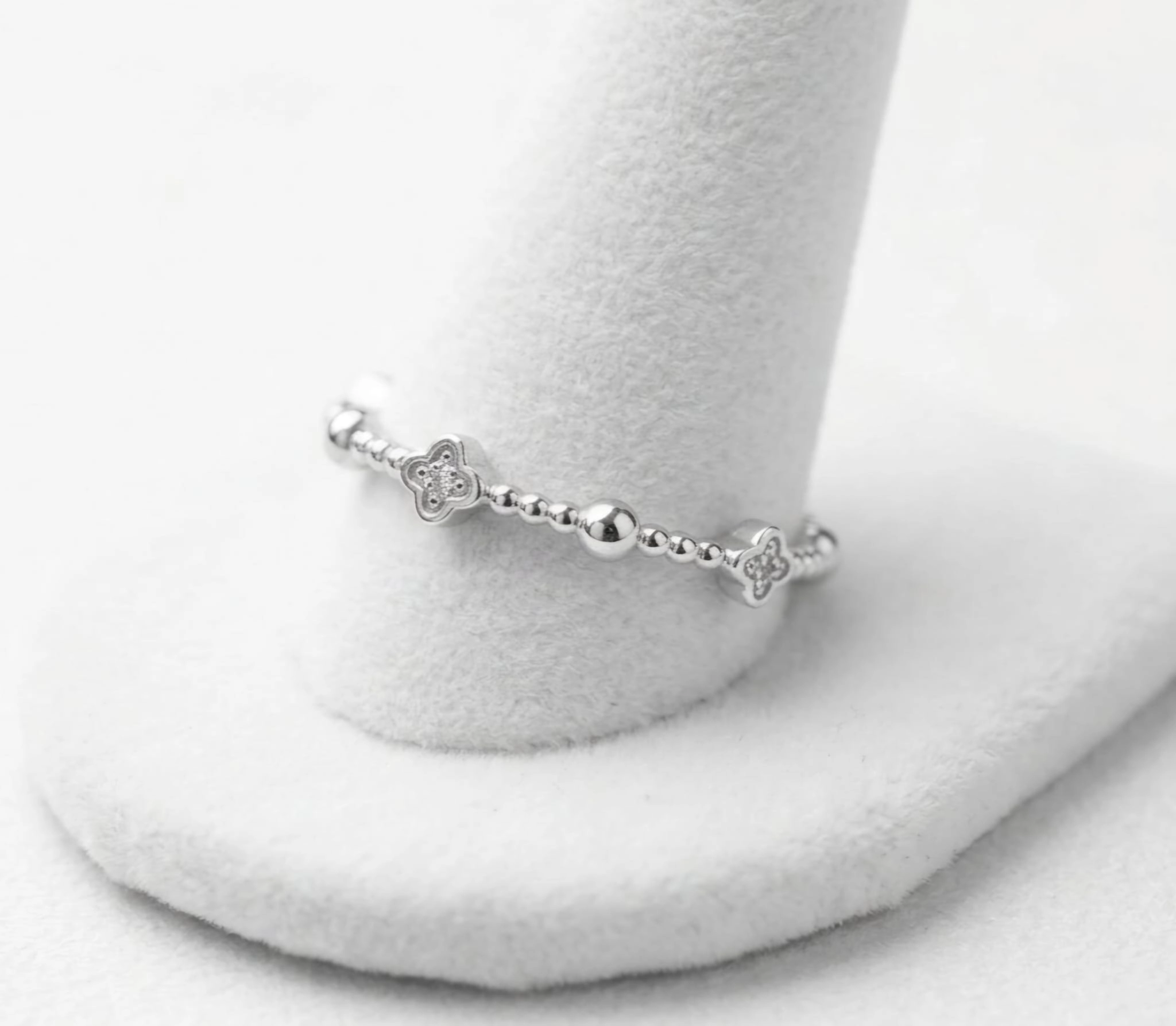 Dizajn: Motiv „Nežni dodir“ sa diskretnim cvetićima od cirkona i nizom srebrnih perli.