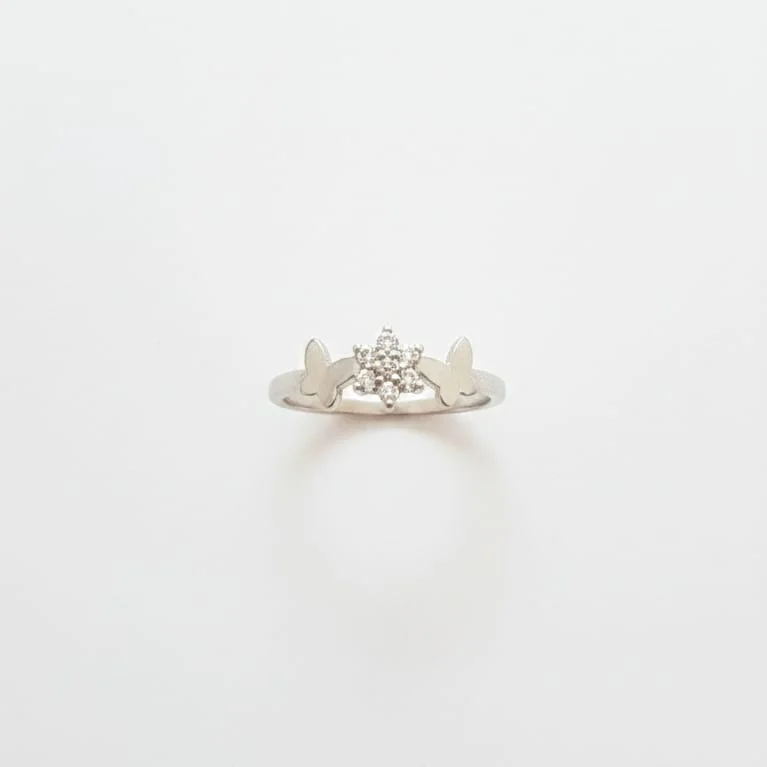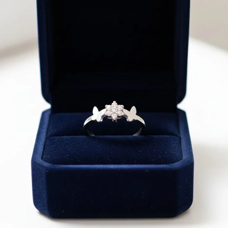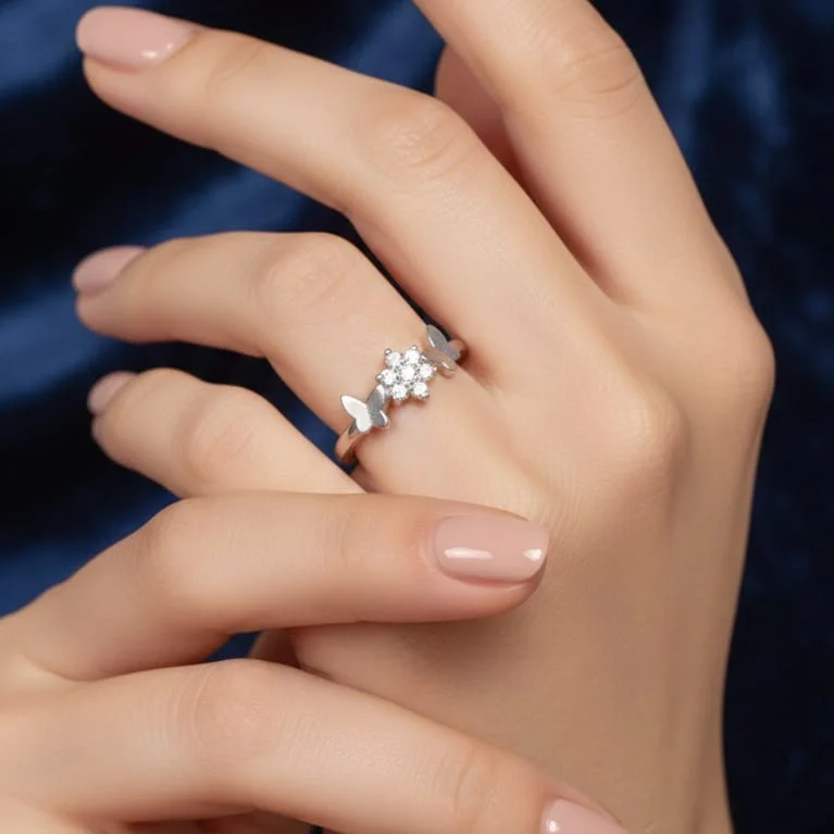 Ovaj komad nakita izrađen je od sertifikovanog srebra finoće 925. Specifičnost modela ogleda se u kombinaciji tekstura – krila leptira imaju suptilnu, glatku završnicu, dok je centralni cvet ispunjen nizom sitnih, sjajnih cirkona koji reflektuju svetlost pri svakom pokretu. Ovakva preciznost u izradi osigurava da prsten zadrži svoj sjaj i formu tokom vremena. Materijal je hipoalergen, što ga čini bezbednim i udobnim za svakodnevno nošenje.