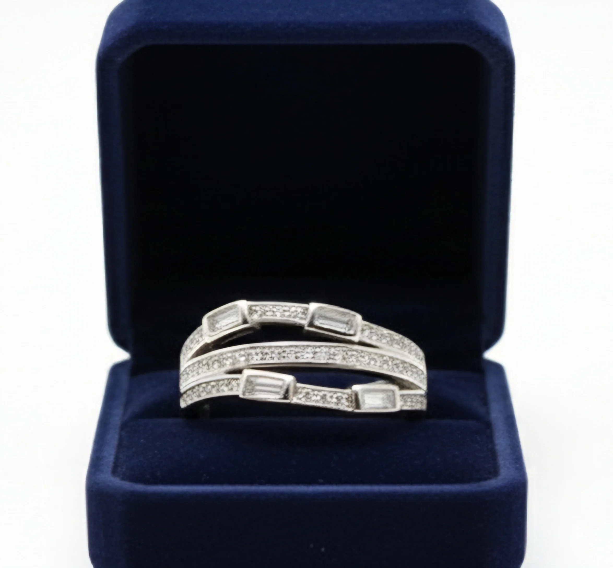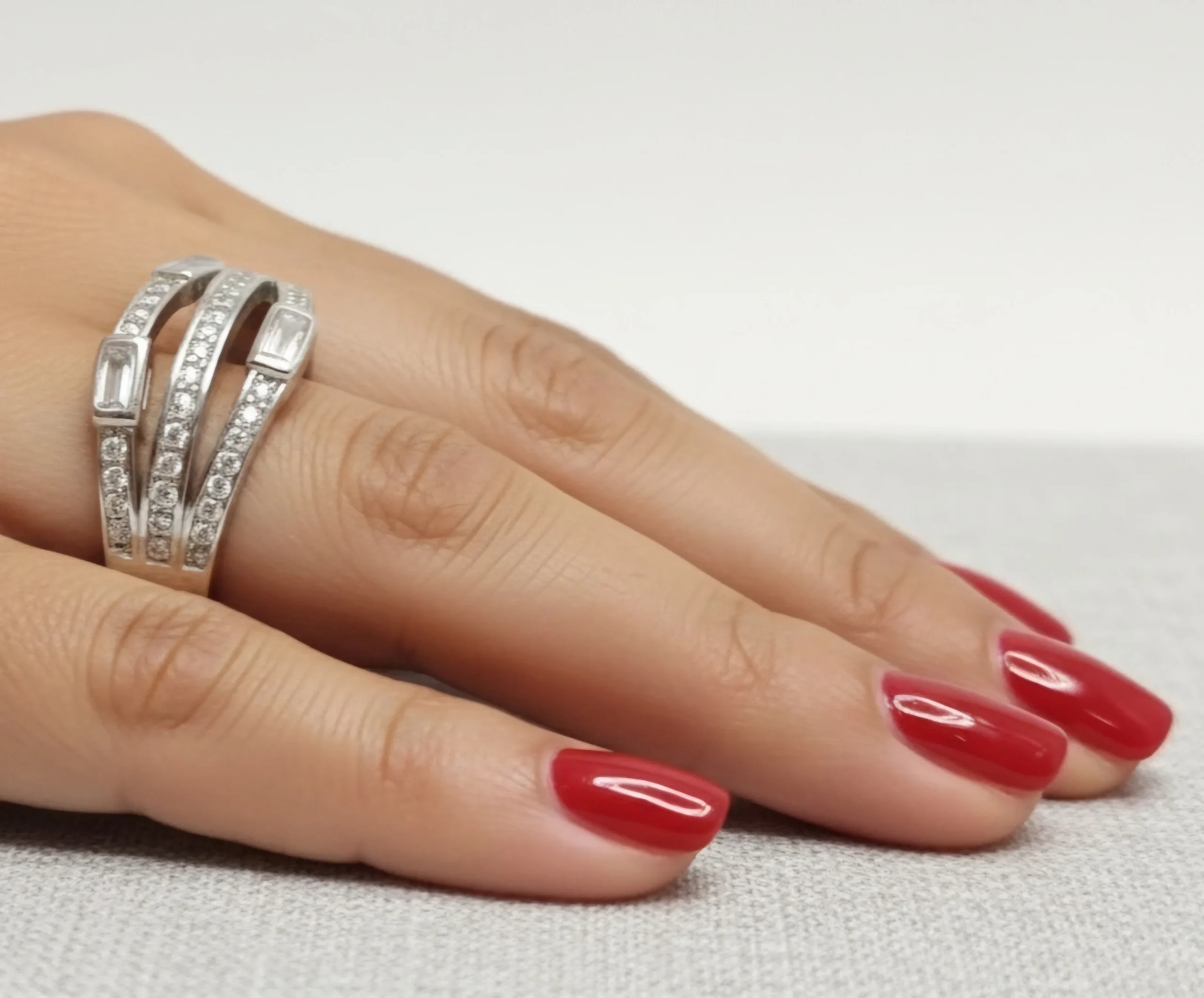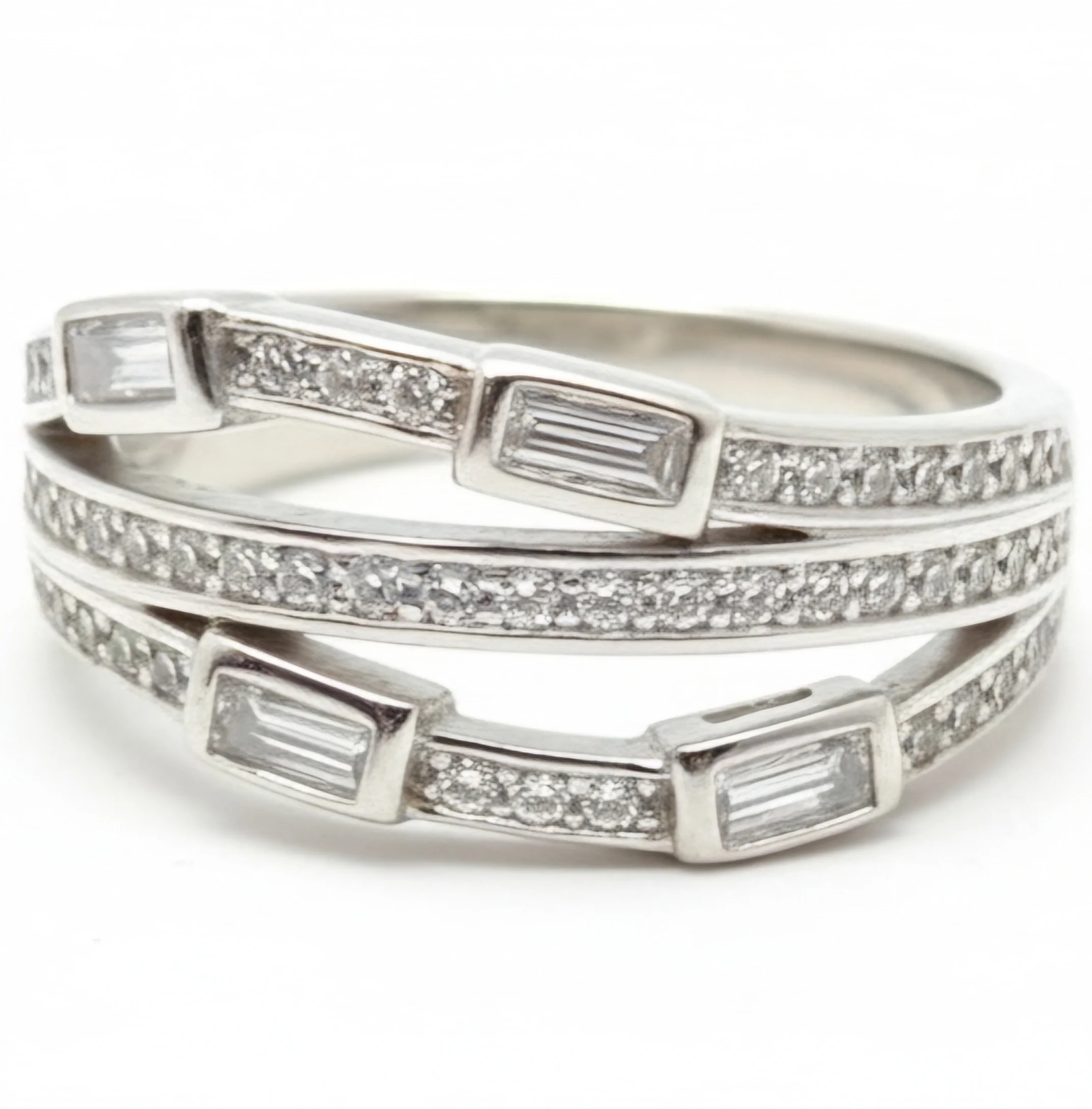 Srebrni prsten Triple Elegance predstavlja vrhunac modernog zlatarstva. Izrađen od srebra finoće 925, ovaj model krase tri paralelna niza optočena blistavim cirkonima. Poseban pečat daju mu pravougaoni baguette kristali koji unose dozu avangarde u klasičan sjaj. Sa prečnikom od 16mm, ovaj prsten je stvoren za dame koje žele upečatljiv i luksuzan detalj.